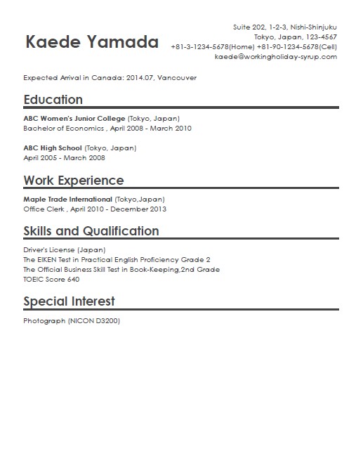 カナダワーキングホリデー・英文履歴書ツール カナダワーキングホリデー・英語履歴書ツール